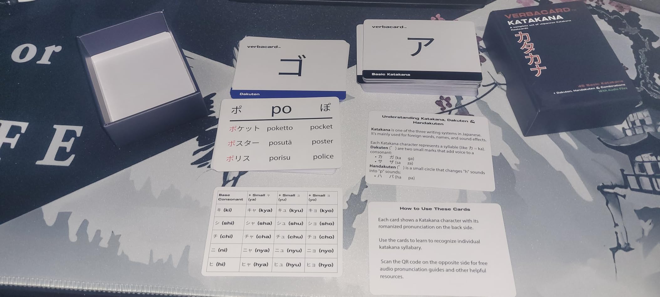 These variations expand Katakana from 46 base characters into over 70 sound patterns — and Verbacard makes them easy to recognize and remember.